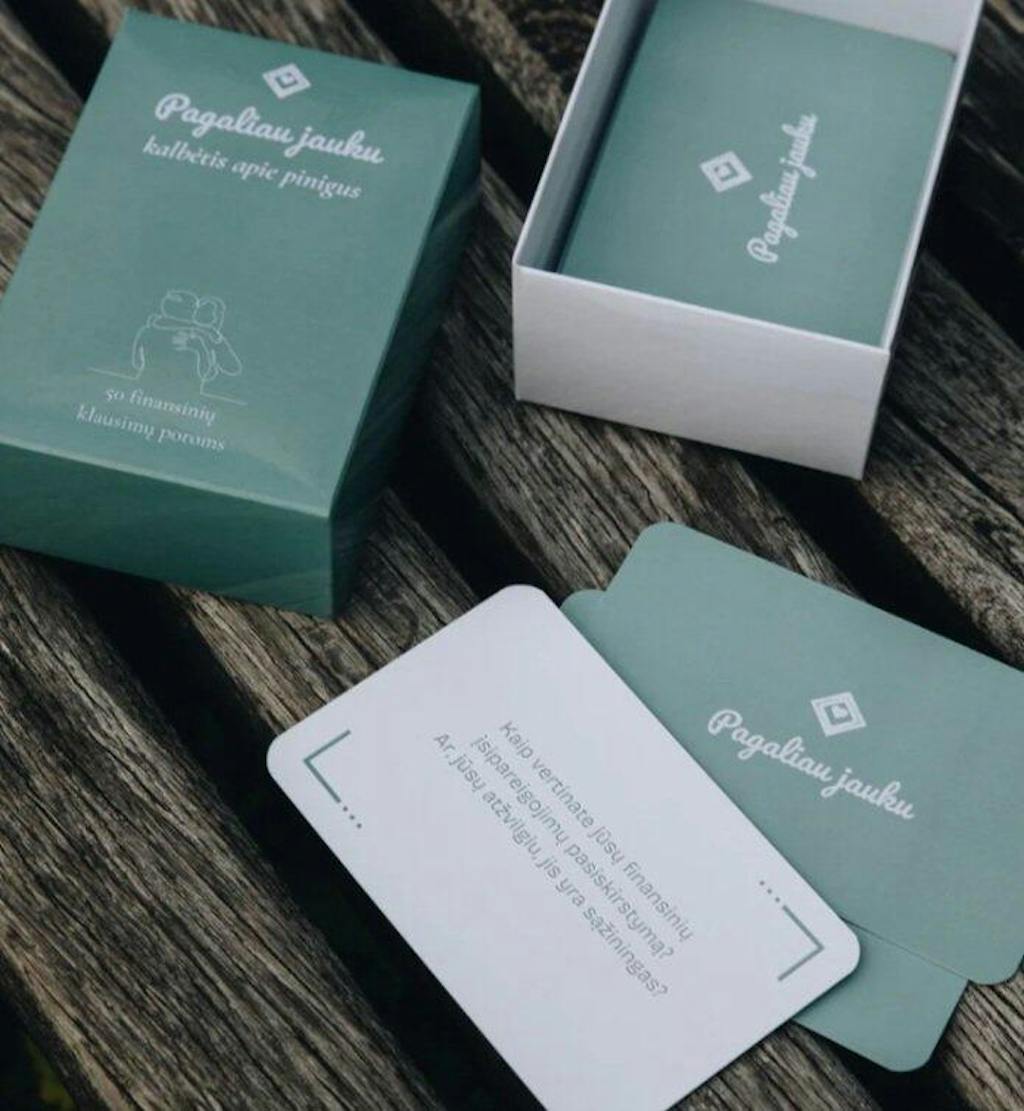 Pokalbių kortelės apie finansus – unikalus 50 atvirų klausimų rinkinys, sukurtas tam, kad paskatintų gilesnius, nuoširdžius ir prasmingus pokalbius porose ar draugų rate. Tai ne žaidimas apie pinigus – tai kvietimas pažinti vienas kitą per finansinį sąmoningumą, įpročius, svajones ir požiūrį į pinigus.