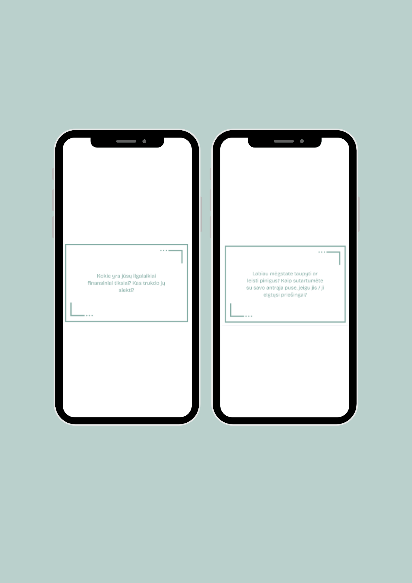 Skaitmeninės pokalbių kortelės apie finansus – tai unikalus 50 atvirų klausimų rinkinys, sukurtas tam, kad paskatintų gilesnius, nuoširdžius ir prasmingus pokalbius porose ar draugų rate. Tai ne žaidimas apie finansus – tai kvietimas pažinti vieną kitą per finansinį sąmoningumą, įpročius, svajones ir požiūrį į pinigus.